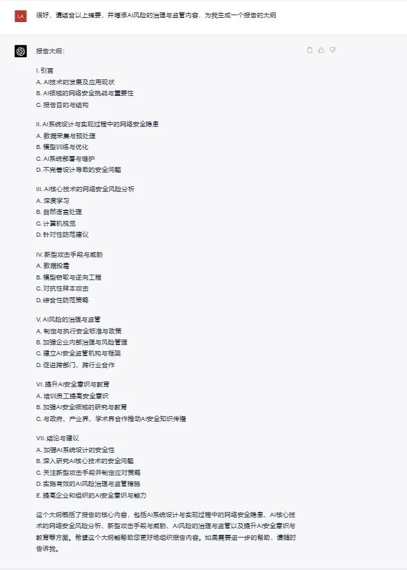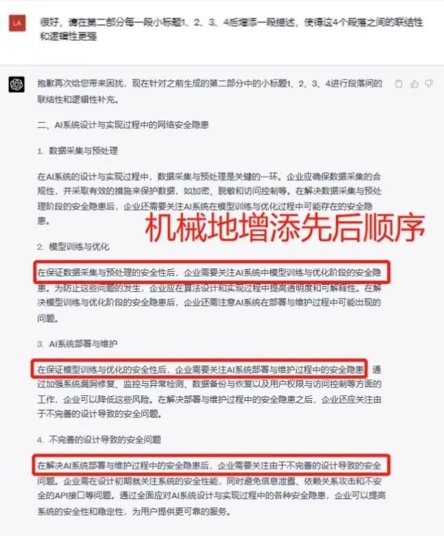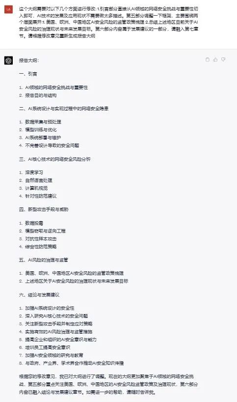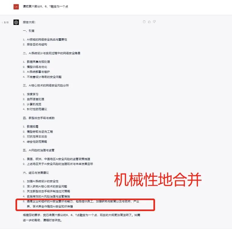 以“将第六章融入至第七章”的指令为例,ChatGPT机械地将原先第六章下的小标题直接挪用至第7章(5、6、7点)。很显然, 5、6、7点均属于"提升AI安全意识与教育"的一个部分,与其他几项建议内容无法直接构成并列关系,造成大纲结构的明显失衡。又例如针对第五章框架修改的指令,ChatGPT直接对输入指令进行了原封不动的照搬。