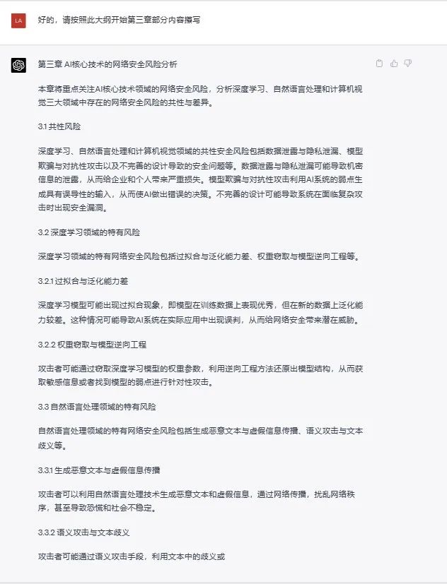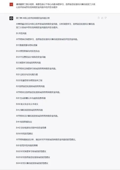 我们针对上述问题对第三章框架进行调整,要求ChatGPT描述三大核心AI技术领域存在的网络安全风险中的共性与差异。