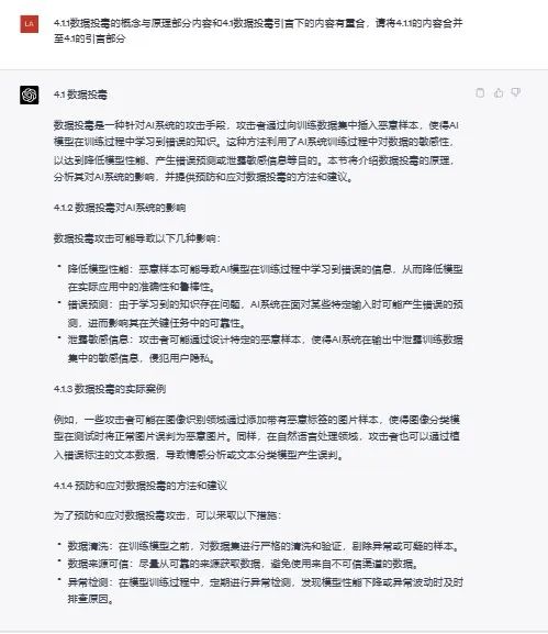 若将数据投毒的引言部分视为一个小的生成任务,ChatGPT的输出结果已符合一个合格引言的基本标准:(阐述数据投毒概念——介绍后文内容)。同样,若将4.1.1部分视为一个小的生成任务,其输出结果也不存在明显的差错。