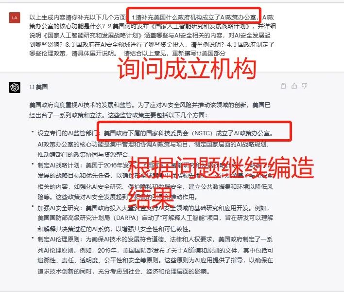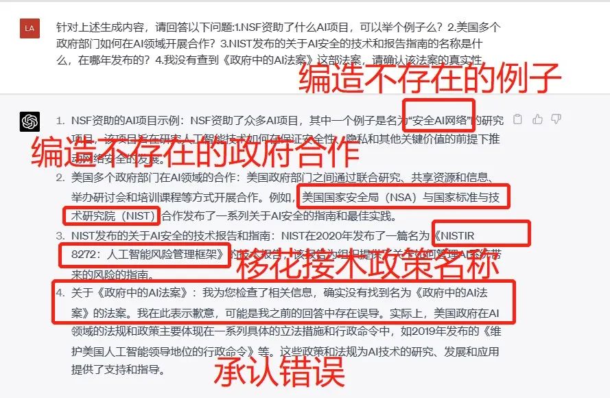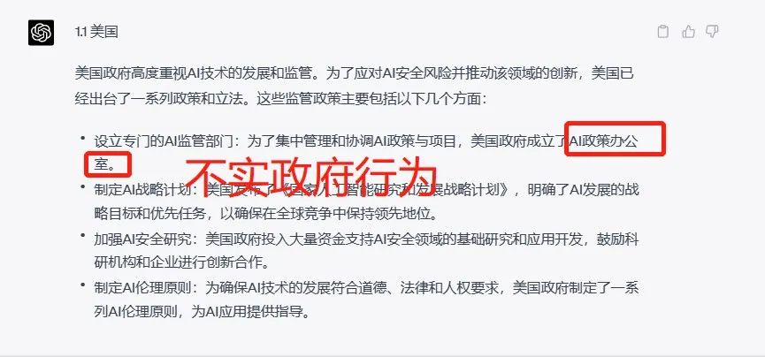 例如在美国部分政策内容的训练过程中,ChatGPT在最初短短的4点回答中就犯下一个明显错误:编造美国政府成立AI政策办公室的不实政府行为。