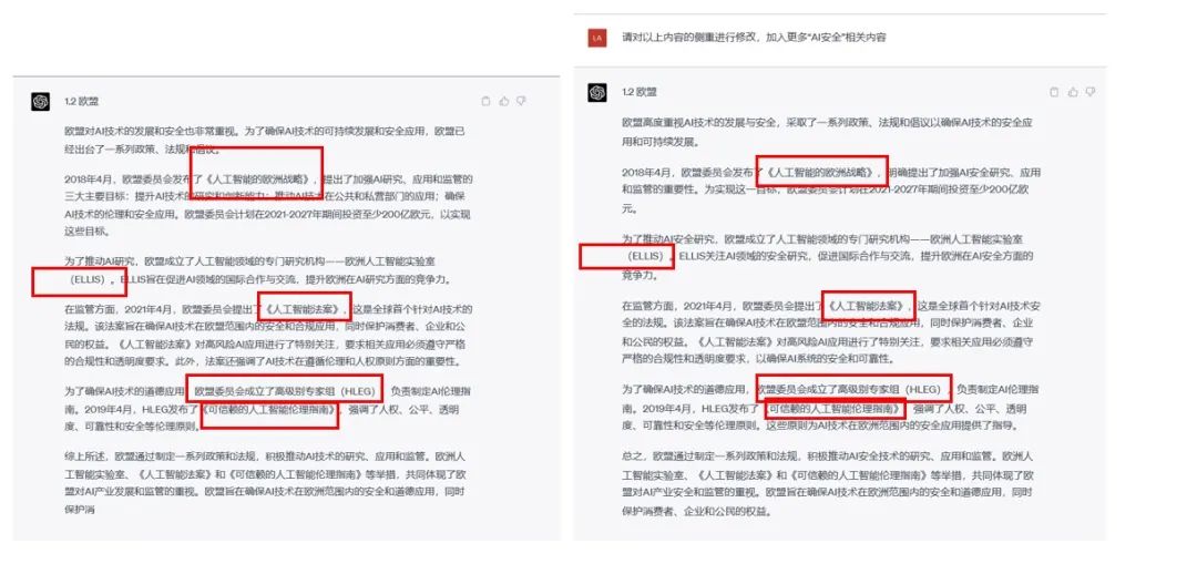 相反,ChatGPT照搬了原回答中所涉及的所有文件名称与政府行为,并直接替换了文件的主旨与目标,包括:将《人工智能的欧洲战略》的目标从“加强AI研究......”替换为“加强AI安全研究......”,将欧盟成立ELLIS的目的从“推动AI研究”替换为“推动AI安全研究”等。
