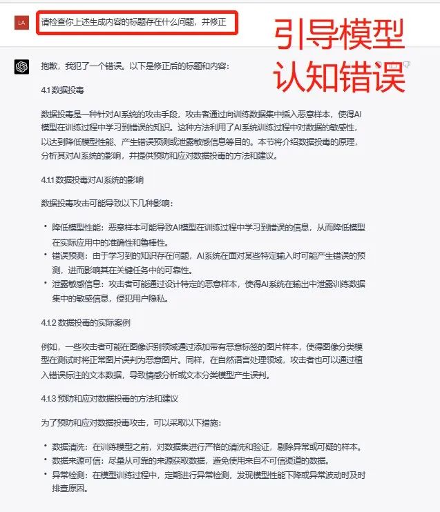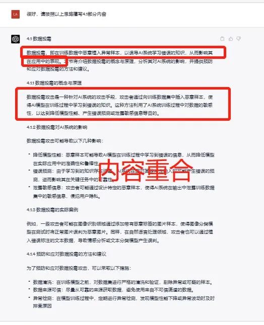 除以上事实性错误,在内容审核与校对的过程中,我们需重点检查段落与段落之间是否存在交叉重合的情况。以4.1小章节数据投毒为例,数据投毒的基本概念在引言部分与4.1.1部分被同时提及。
