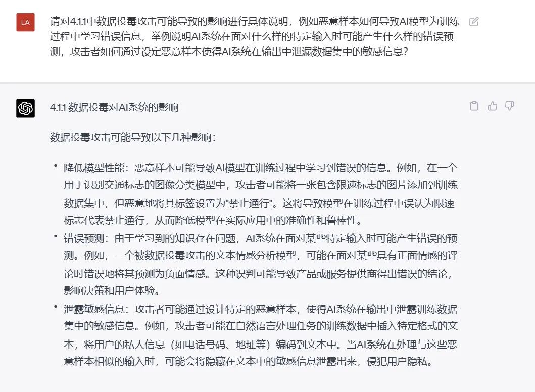 以报告4.1.1为例,我们在要求报告对数据投毒内容进行具体说明时,通过追问成因、要求ChatGPT举例说明等具象化描述,框定了信息需求方向。