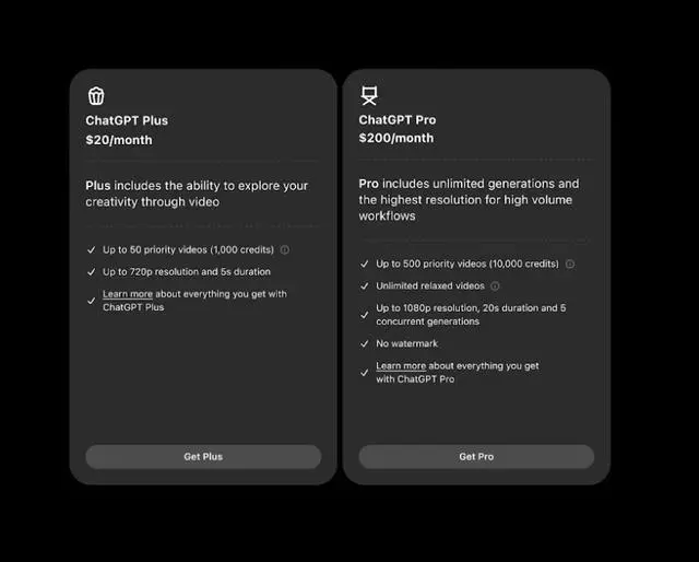 而ChatGPT Pro订阅(200美金/月)则提供无限生成次数,最多可生成500个优先视频,分辨率提升至1080p,视频时长可达20秒;Pro用户还可以下载无水印视频,并支持同时并发生成最多5个任务。