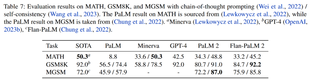 从基准测试上可以看到,对于具有思维链 prompt 或自洽性的 MATH、GSM8K 和 MGSM 基准评估,PaLM 2 的部分结果超越了 GPT-4。![]()