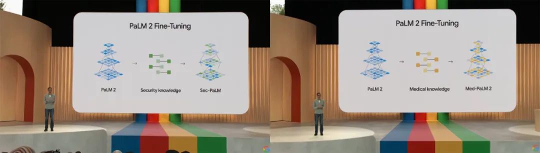 谷歌内部已经有超过 70 个产品团队正在使用 PaLM 2 构建产品,包括分别针对安全知识和医疗知识微调而成的 Sec-PaLM 和 Med-PaLM 2。![]()