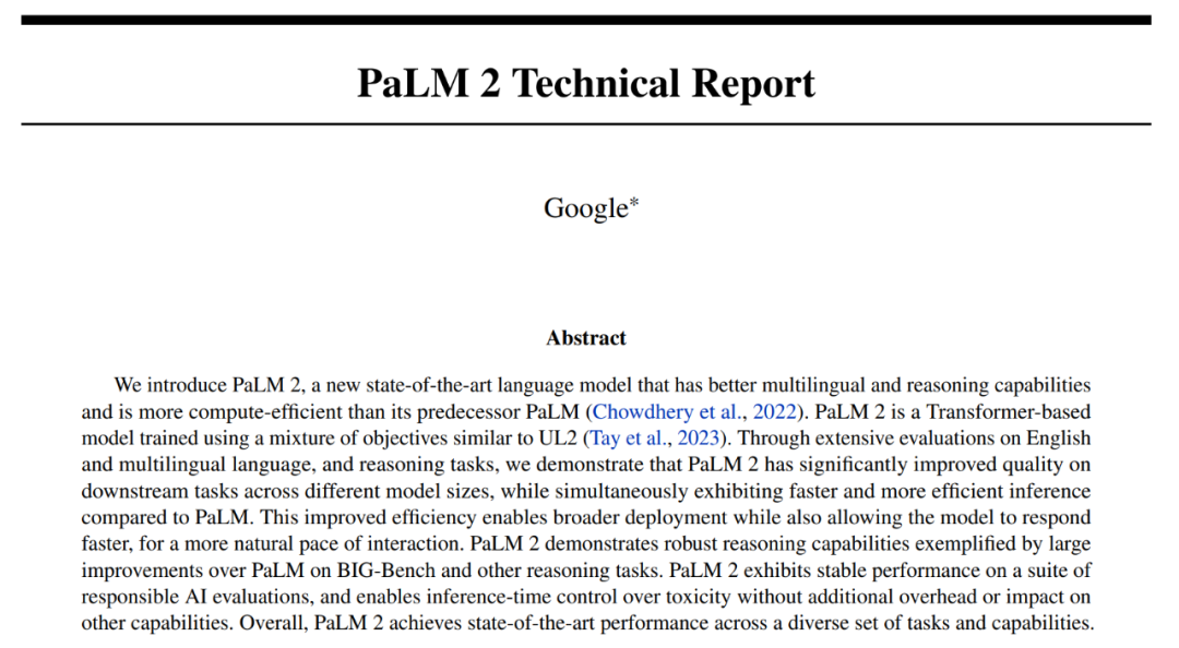 目前,开发者可以通过谷歌的 PaLM API、Firebase 以及 Colab 访问 PaLM 2。皮查伊还表示,PaLM 2 将继续为谷歌最新的 Bard 提供支持。在皮查伊演讲的同时,谷歌放出了 PaLM 2 的论文,整整 91 页。但令人失望的是,PaLM 2 论文远没初代 PaLM 有诚意,和 GPT-4 一样,更像是技术报告。![]()