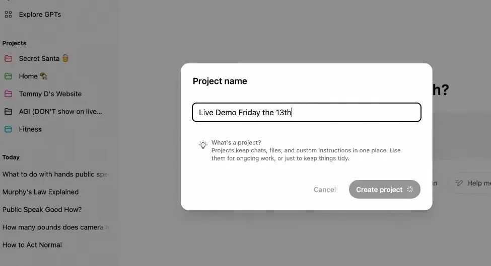 简单来说,“Projects” 是 ChatGPT 中的一种新型组织工具。它允许用户创建特定项目,上传相关文件,设置自定义指令,并将所有与该项目相关的对话集中在一个地方。你可以将其理解为一种智能文件夹,它不仅能帮助你整理对话,还能为复杂任务提供上下文支持