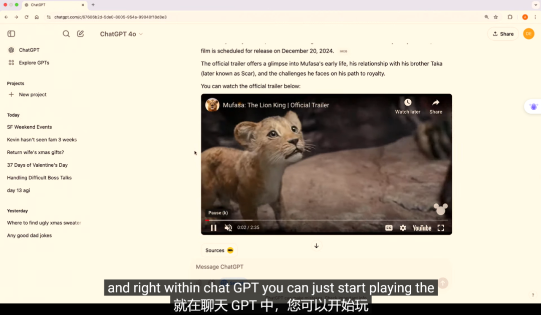 用户可以像与真人对话一样,自然地提出问题,并得到即时的回答。例如,用户可以询问关于旧金山周末活动的建议,然后根据天气情况进一步询问室内活动建议,如看电影,这种对话式的交互变得更加个性化。