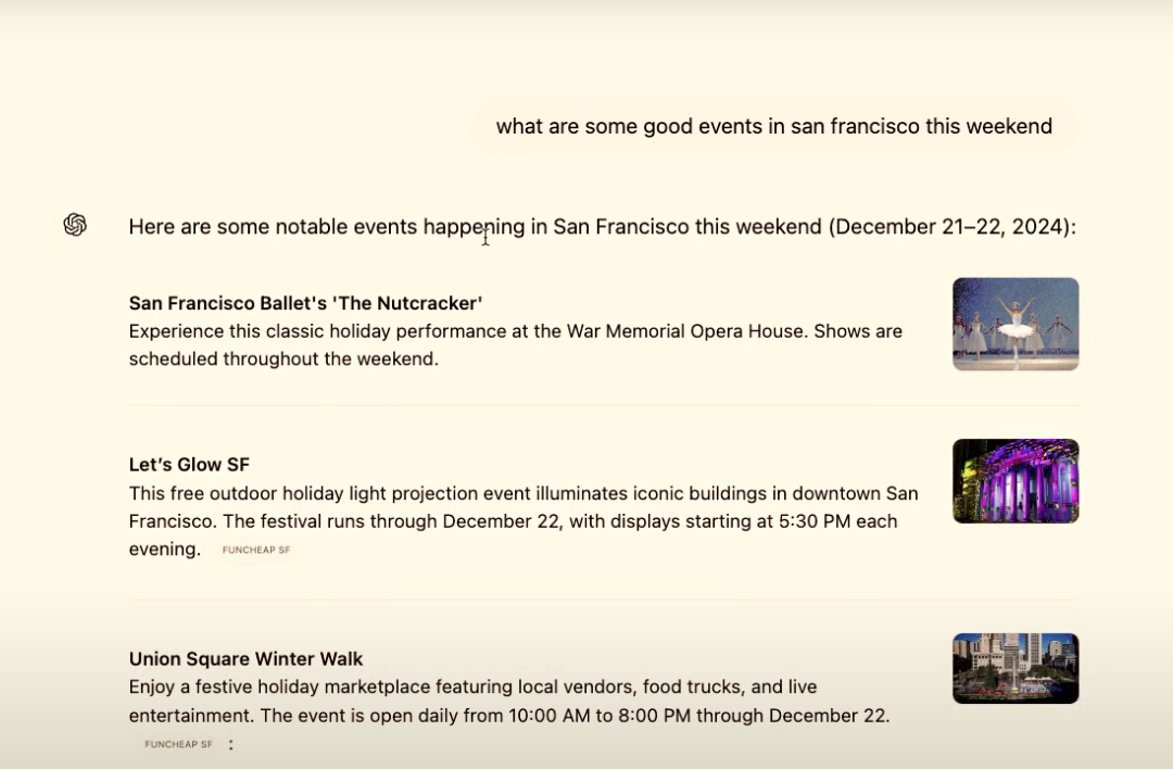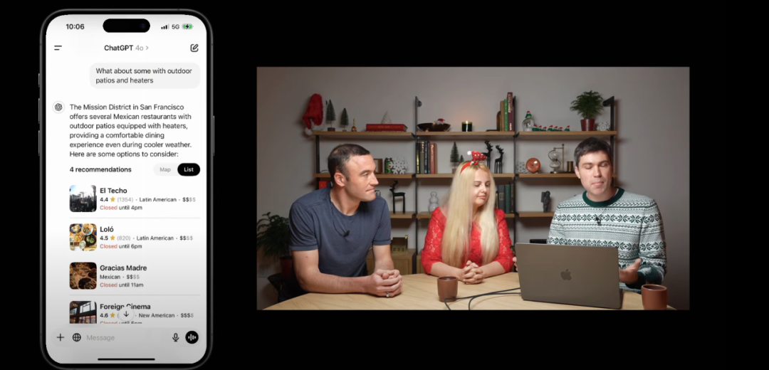 针对移动设备,OpenAI 根据用户反馈优化了聊天搜索的体验。现场通过一个寻找美食场所的例子,展示了如何在聊天中直接看到丰富的图像和企业的可视化列表,以及如何快速访问企业的详细信息,如路线、网站、电话和营业时间等。