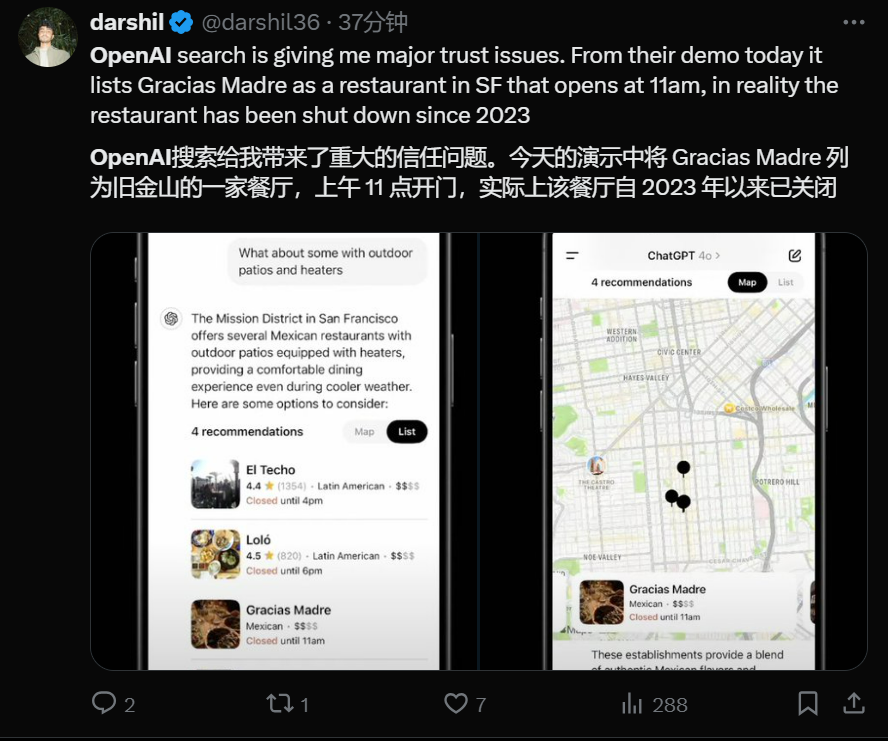 不过,在 X 上面就有人吐槽让他产生了严重的信任问题,从他们今天的演示中可以看出,Gracias Madre 是一家上午 11 点开门的旧金山餐厅,但实际上这家餐厅在2023年其实就已经关闭。