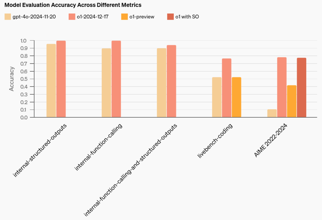 据介绍,OpenAI刚发布的 o1 是两周前在 ChatGPT 中发布模型的新后训练版本,在几项基准测试中均取得了最新成果,并提高了成本效益和性能。此外,OpenAI观察到, 其在函数调用和结构化输出测试中明显优于 o1-preview。