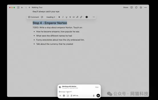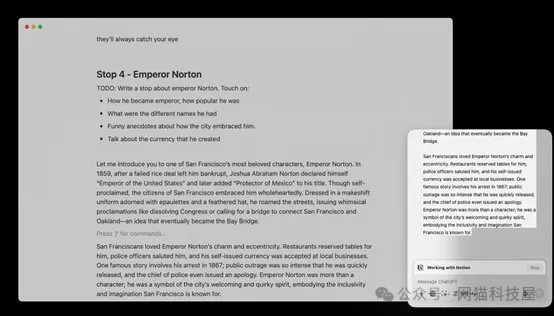 ChatGPT在写作领域的协作功能同样令人印象深刻。在演示中,开发者使用Notion编写了一份关于旧金山历史的徒步游览指南。其中提到了“诺顿皇帝”的故事,但开发者希望将内容写得更生动,同时确保内容的准确性。
