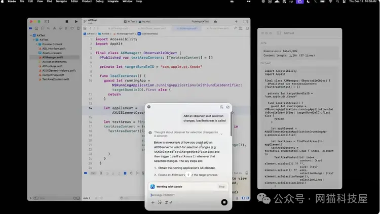 在另一个示例中,开发者希望在Xcode IDE中为一个示例应用程序添加观察者功能,以监测文本区域的变化。ChatGPT利用其思维链模型(o1模型)生成了所需代码。尽管首次尝试未成功,但经过调整后,功能得以顺利实现。这也展现了ChatGPT对复杂编程任务的理解和自动化能力。