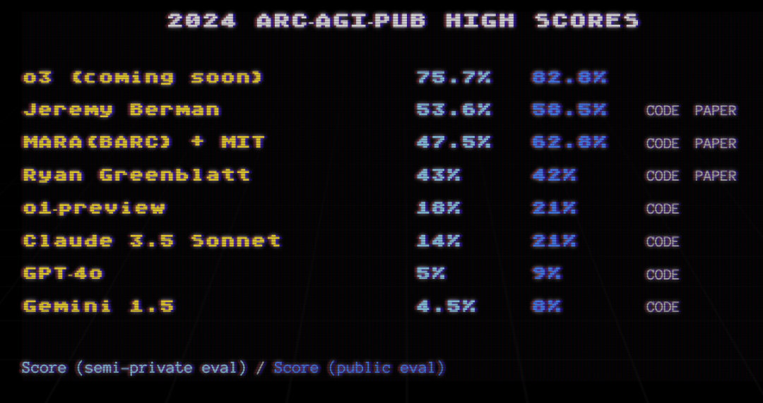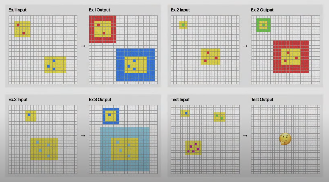 除了这几个很常见的测试集,甚至引入了一个不太常见的测试集ARC AGI,它的全称是Abstraction and Reasoning Corpus for Artificial General Intelligence,专门设计出来测试AI。