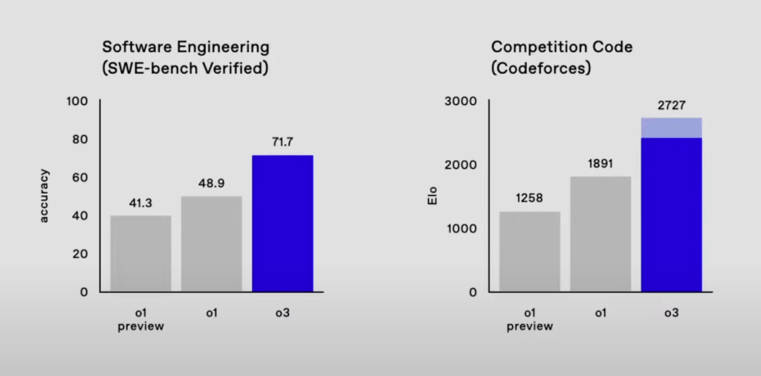 新的o3模型在推理上更进一步,在Software Engineering和Codeforeces这俩测试上分数相比它的上一代,o1模型提升很大。