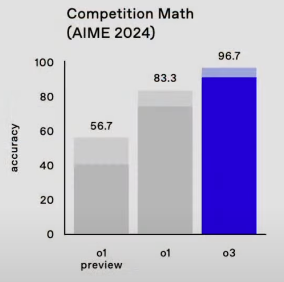 然后在数学上也有了提升,在AIME这个测试集上o1就已经达到了83.3,o3直接把准确率提升到了96.7,几乎相同于一套数学卷子只错一个的程度。