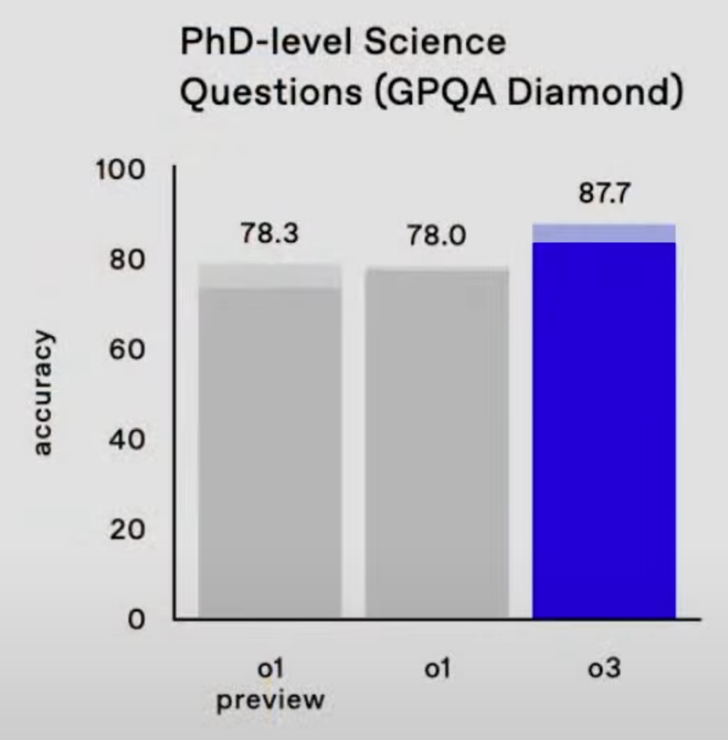 o1模型可以做到78分左右,o3直接把分数拉到87.7,远超人类选手的程度。