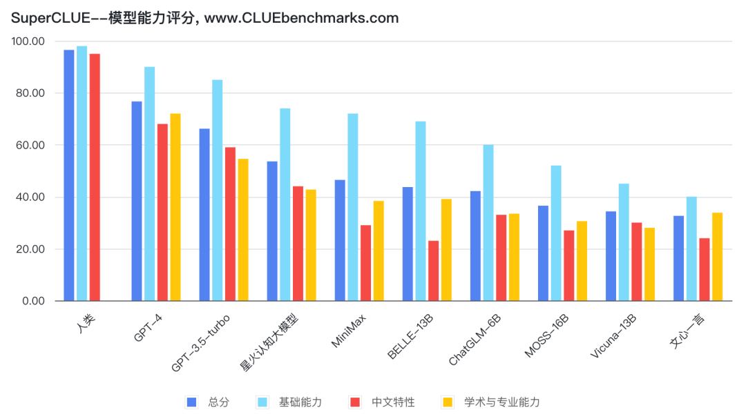 5月9日,中文通用大模型综合性评测基准SuperCLUE正式发布,并对市面上主流的支持中文的通用大模型进行了评测与排名,而这可以作为我们评价星火大模型的参考。