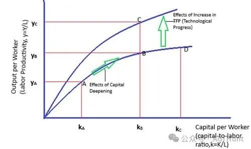 图中展示了两个关键指标:劳动生产率(y/L)和资本-劳动比率(k/L),当技术进步(TFP)发生时,整条生产率曲线都会发生上移,这正是AI对工程师产生的重大影响——它不仅提供了新的工具,更重要的是从根本上提升了生产可能性边界。