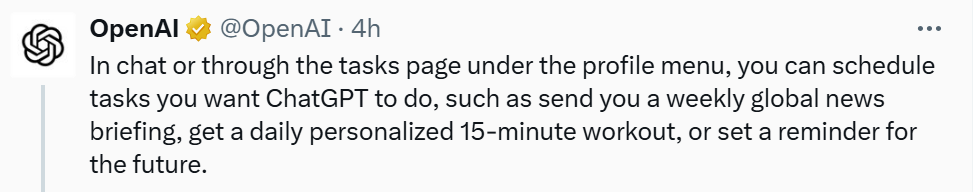 OpenAI 刚刚为 ChatGPT 推出了一项名为「Tasks」的新功能,赋予其执行力。这意味着 ChatGPT 不再仅限于对话和回答问题,而是能够直接执行用户指定的任务。通过这一功能,用户可以通过简单的指令让 ChatGPT 完成各种操作,例如发送邮件、管理日程、搜索信息等。这一升级标志着 ChatGPT 从单纯的聊天助手向多功能智能工具的转变,进一步提升了其实用性和效率。OpenAI 表示,这一功能将逐步向更多用户开放,未来还可能扩展更多复杂的任务执行能力。