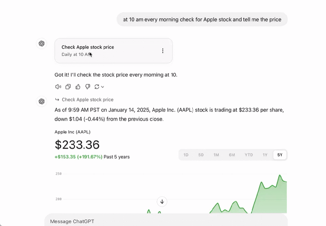 "Tasks"功能允许用户设置一次性或重复性任务,通过简单的指令即可让ChatGPT在指定时间执行特定操作,该功能支持多种实用场景: