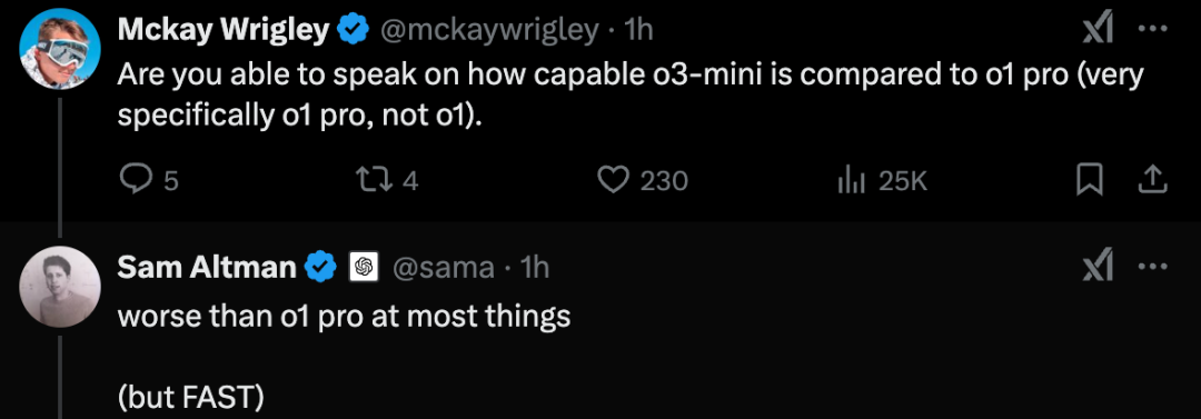在性能方面,Altman 特别强调,尽管 o3-mini 在多项指标上略逊于 o1 pro,但其最大的优势在于极快的推理速度,这一特性使其特别适合对响应时间要求较高的应用场景,例如实时对话系统或高频数据处理任务。