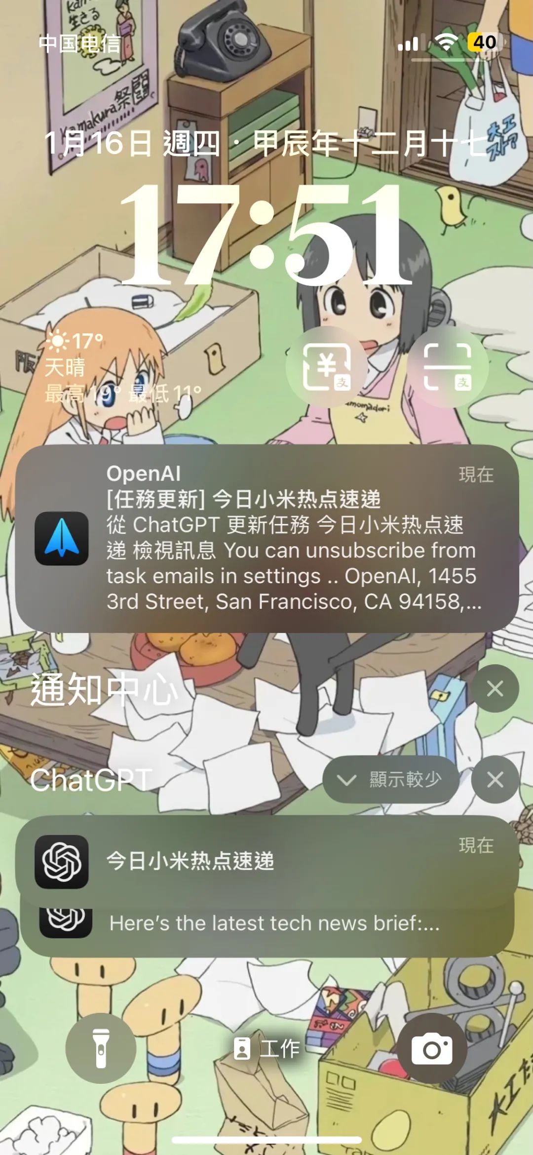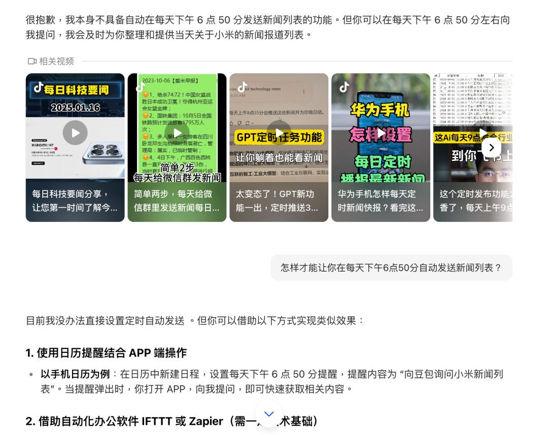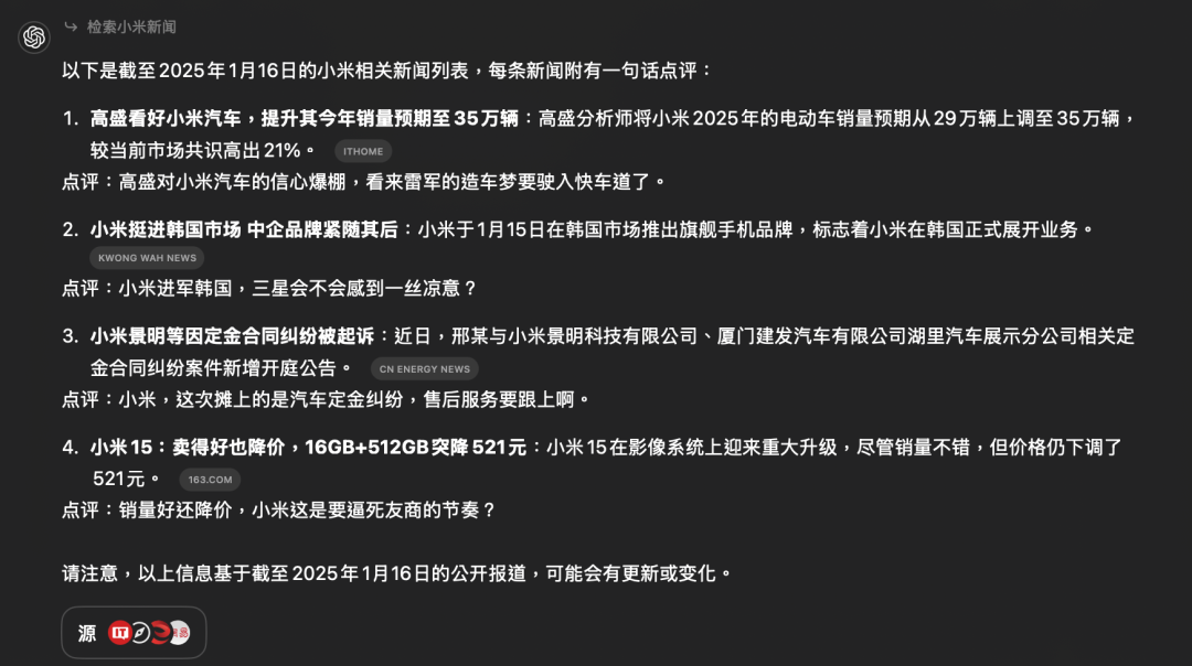 为了更好地理解ChatGPT“任务模式”的实际应用,我进行了一项测试:让ChatGPT每天定时发送一份关于小米的新闻简报,结果显示,ChatGPT能够按时完成任务,并生成了一份2025年1月16日的小米新闻列表。“高盛看好小米汽车”和“小米挺进韩国”是当天媒体报道的重点,列表中也存在一些问题,小米15降价”是几天前的旧闻,而“小米景明”与大众认知的“小米”无关,这可能是由于ChatGPT对中文报道的检索能力有限,以及对国内信息生态的不熟悉。