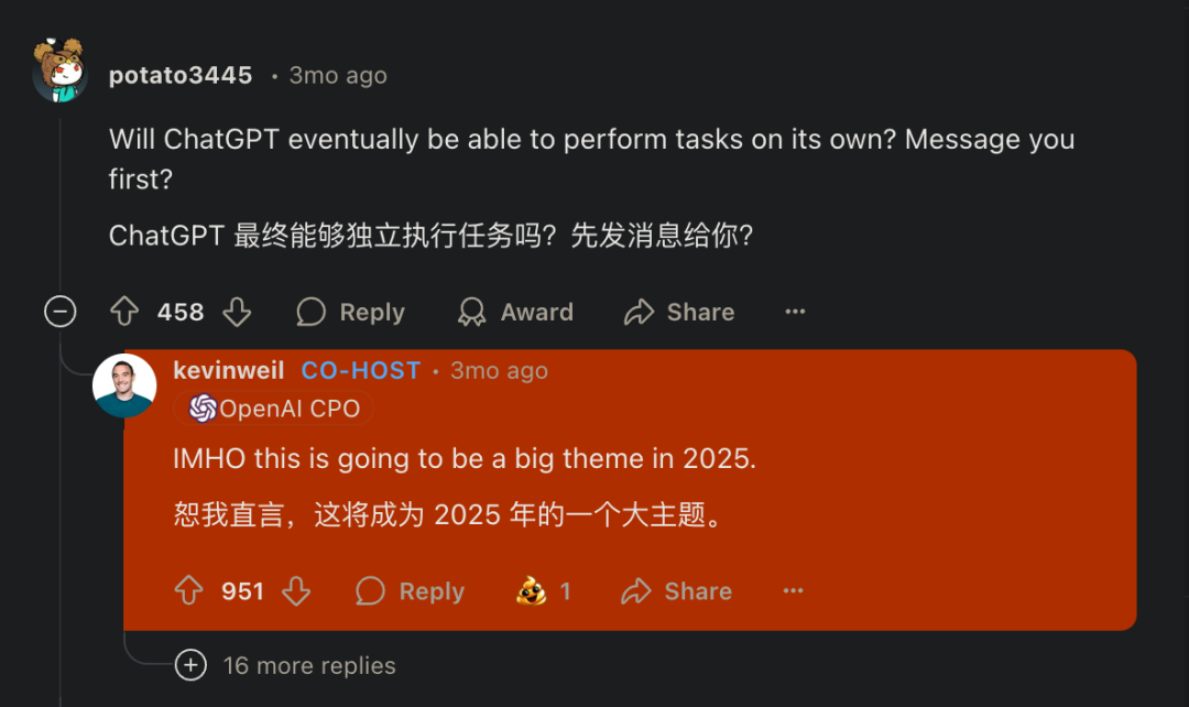 OpenAI首席执行官Sam Altman曾预言,2025年将成为智能体技术的元年,首席产品官Kevin Weil也在Reddit AMA中表示,ChatGPT主动发送消息和独立执行任务将是2025年的重要主题,目前市场上许多所谓的“智能体”实际上只是定制了上下文的软件模块,而非能够代替用户执行操作的“真·智能体”。