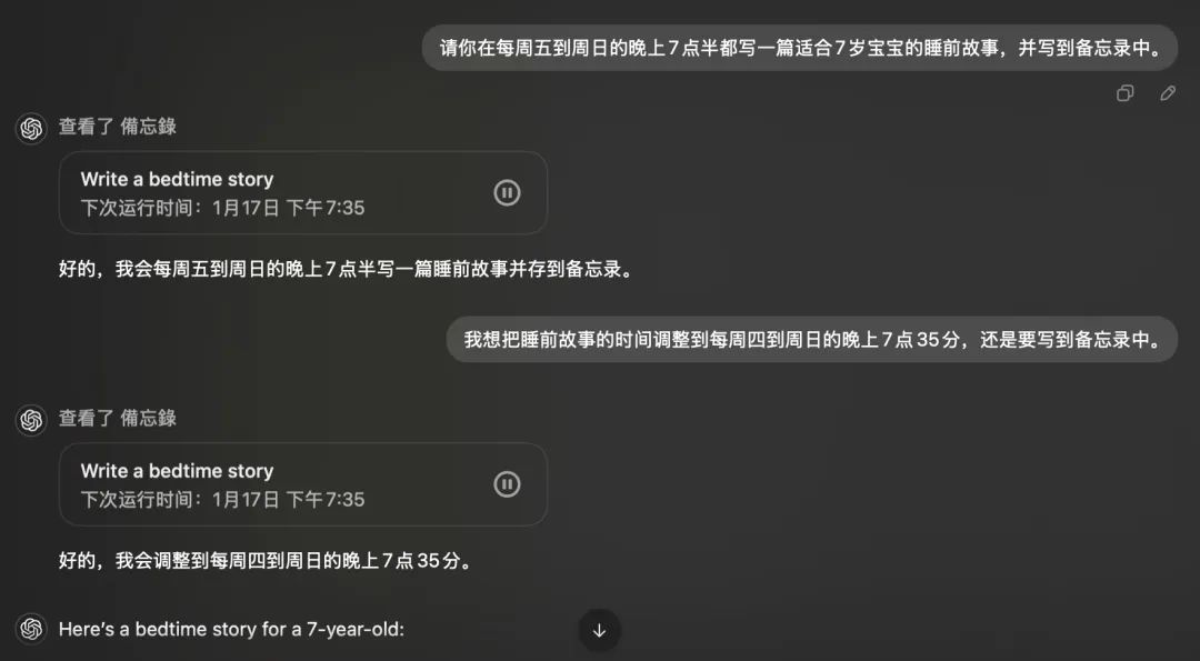 从使用体验来看,ChatGPT“任务模式”确实带来了与常规聊天模式不同的价值,它不仅能够满足即时的信息需求,还能处理定期任务,例如生成新闻简报、撰写睡前故事、追踪股市动态,甚至在学习场景中充当督促者,这种功能的引入,使得ChatGPT从“遇问题才开启对话”的聊天机器人,逐渐演变为“主动联系用户”的数字助手。
