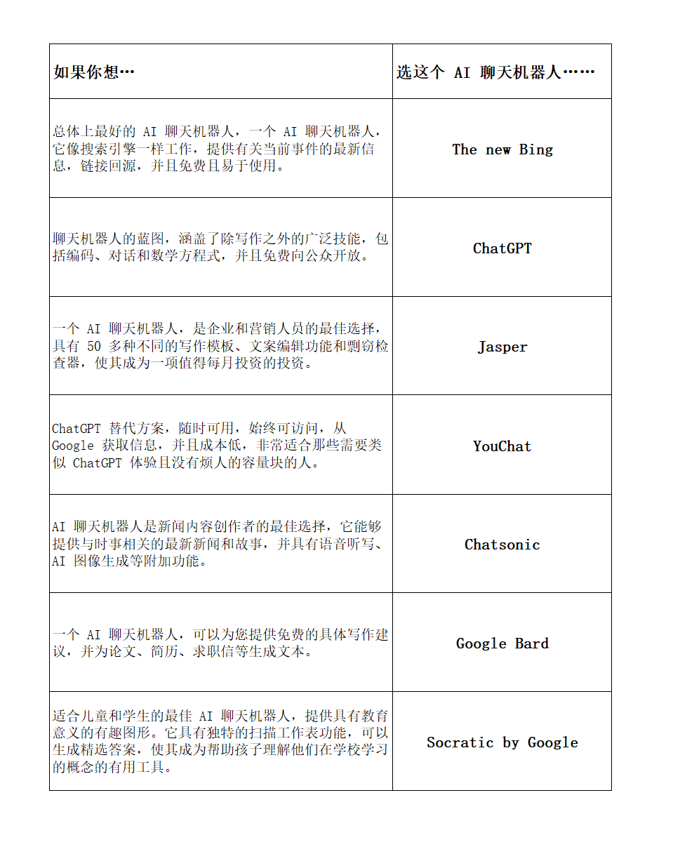 为了策划最佳 AI 聊天机器人和 AI 写作的名单,我们研究了每个程序的能力,包括每个程序擅长的个人用途。我们考虑的其他因素是可靠性、可用性和成本。一旦我们收集了所有这些数据并亲自试用,我们就确定了哪个 AI 聊天机器人最适合不同个人的需求,并将它们包括在列表中。AI 聊天机器人(也称为 AI writer)是指一种人工智能驱动的程序,能够根据用户的输入提示生成书面内容。人工智能聊天机器人能够根据用户的要求编写从说唱歌曲到散文的任何内容。每个聊天机器人具体能够写的内容的范围取决于它的个人能力,包括它是否连接到搜索引擎。AI 聊天机器人使用语言模型来训练 AI 以产生类似人类的反应。有些人连接到网络,这就是他们获得最新信息的方式,而其他人则完全依赖于他们接受培训的信息。AI 聊天机器人程序的成本各不相同,有些完全免费,有些则每月花费高达 600 美元。ChatGPT 和 YouChat 完全免费,因为两者仍处于测试阶段。像 ChatSonic 这样的服务,2,000,000 个单词和 15 个席位,每月费用高达 650 美元。AI 聊天机器人和 AI 写作之间的主要区别在于它们生成的输出类型及其主要功能。过去,人工智能作家专门用于根据给定的提示或输入生成文章、故事或诗歌等书面内容。人工智能写作的输出是模仿人类语言和结构的书面文本形式。另一方面,人工智能聊天机器人旨在通过文本或基于语音的交互与用户进行实时对话。人工智能聊天机器人的主要功能是回答问题、提供建议,甚至执行简单的任务,其输出以基于文本的对话形式出现。虽然 AI 聊天机器人和 AI 写作这两个术语现在被一些人互换使用,但最初的区别是 AI 作家用于生成书面内容,而 AI 聊天机器人用于对话目的。然而,随着 ChatGPT 等更先进的人工智能技术的引入,两者之间的界限变得越来越模糊。一些 AI 聊天机器人现在能够生成基于文本的响应,这些响应模仿人类语言和结构,类似于 AI 写作。是的!尽管New Bing 非常受欢迎,但人工智能聊天机器人有一些主要缺点,包括它并不总是可用。如果您想尝试 AI 聊天机器人和 AI 写作的世界,还有很多其他选择可供考虑。我们深入探讨了上面的备选方案,以及下面的更多备选方案。