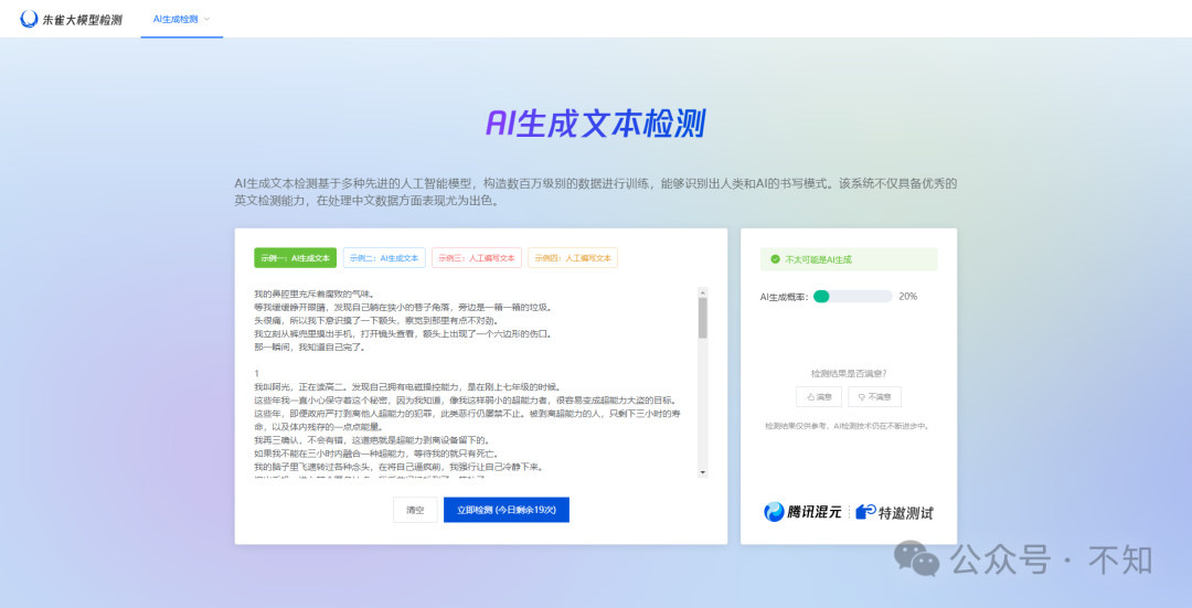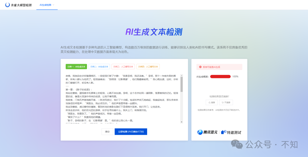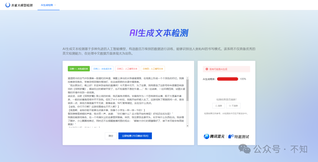 腾讯推出了一款名为「朱雀大模型检测」的工具,用于检测AI生成的图像和文本,这一工具引起了广泛关注,尤其是在内容创作领域,此前,我曾在《你用AI写的网文,到底会不会被编辑发现?》一文中测试过三款中文AI检测工具,但效果并不理想,这次,「朱雀大模型检测」能否准确识别出AI生成的文本与人工创作的内容呢?我决定亲自测试一番。