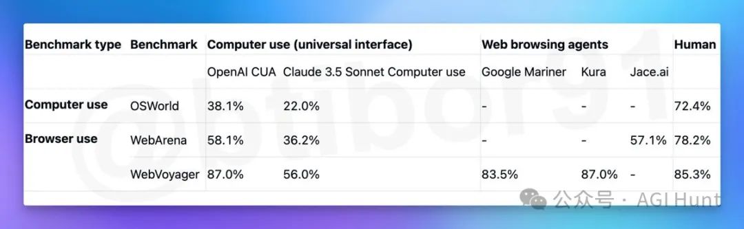 其中「Operator System Card Table」显示:在文本编辑基准测试中,Operator获得了92.3%的高分,而Claude 3.5 Sonnet为89.1%,Google Mariner则为85.6%。