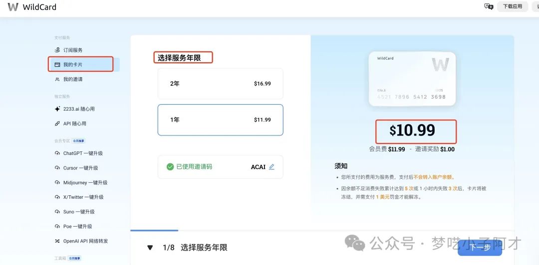 3、点击左上角我的卡片,选择服务年限,也就是卡片使用年限,1年或者 2 年,当然两者服务费是不一样的,然后点击下一步,注意提示内容,最后使用支付宝充值服务费。