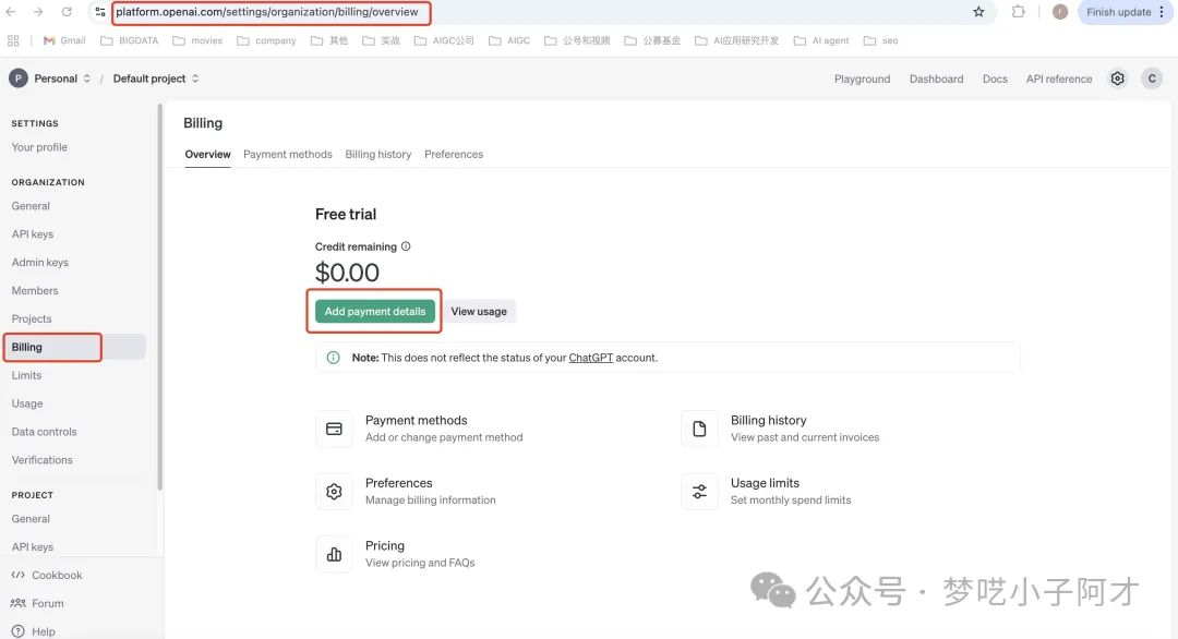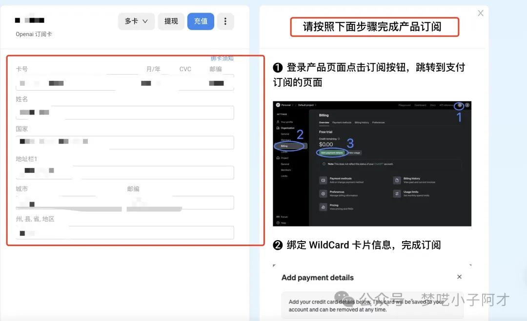 1、登录OpenAI的API平台找到Billing,然后点击Add payment details,然后复制粘贴虚拟卡上的信息到对应的地方。