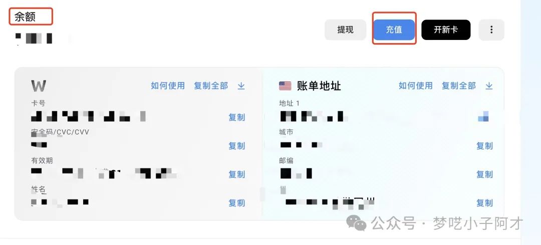 4、开卡成功后,点击充值使用支付宝充值,充值时注意选择OpenAI API服务,充值金额会显示到余额里面,后续就可以使用这张虚拟卡购买OpenAI API了。