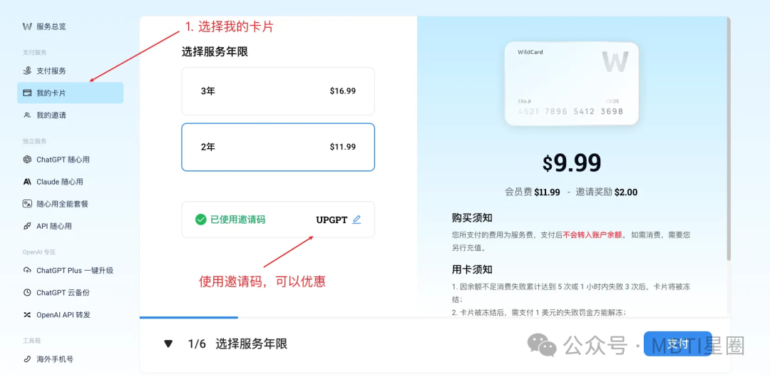3、进入后台,点击左侧导航栏中的“我的卡片”,选择卡片使用期限(建议选择 2 年),并通过扫码支付虚拟信用卡年费。
