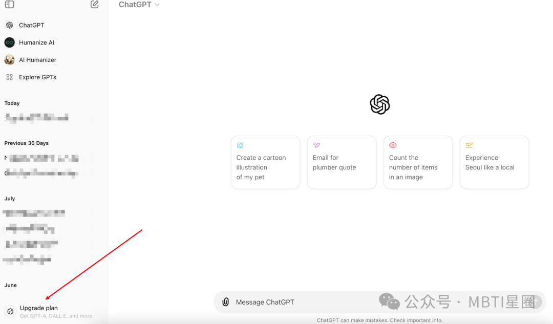 8、在新浏览器窗口中登录您的 ChatGPT 账号,点击左下角的“升级套餐”或“Upgrade Plan”。