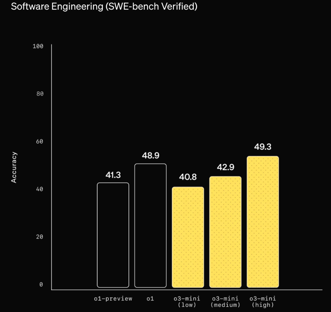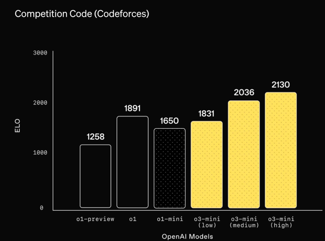 • 更强的性能表现: 在多项基准测试中,o3-mini 都表现出色。例如,在数学、博士级科学问题、代码竞赛和软件工程等领域,o3-mini 都展现出了超越 o1-mini 的能力。尤其是在 Codeforces 代码竞赛 和 SWE-bench 软件工程基准 上,o3-mini 成为了 OpenAI 目前表现最佳的模型!