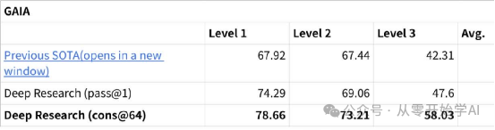 在GAIA(在新窗口中打开)(1)上,这是一个评估现实世界问题AI的公共基准,推动深入研究的模型达到了新的最先进水平(SOTA),位居外部排行榜榜首(在新窗口中打开)。包含三个难度级别的问题,成功完成这些任务需要包括推理、多模态流畅性、网页浏览和工具使用熟练度在内的能力。