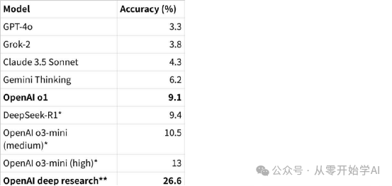 在最近发布的人类最后一次考试(在新窗口中打开)评估中,该模型在专家级别的问题上测试了广泛学科的AI,并以26.6%的准确率获得了新的高度。该测试包括超过3,000个选择题和简短答案问题,涵盖了从语言学到火箭科学,从经典到生态学的100多个学科。与OpenAI o1相比,最大的收益出现在化学,人文社会科学和数学方面。该模型通过在必要时有效地寻找专业信息,展示了一种类似人类的方法。