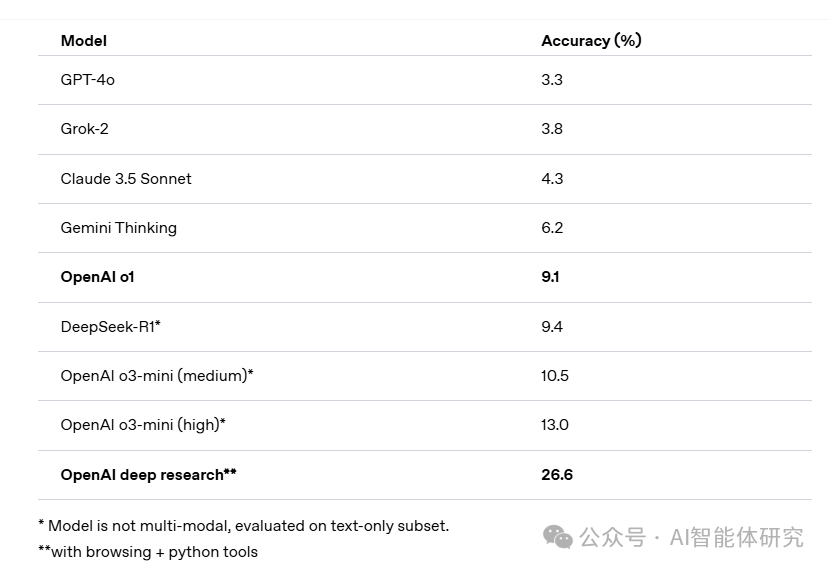 在"人类终极考试"(Humanity's Last Exam)中,Deep Research取得了显著突破: