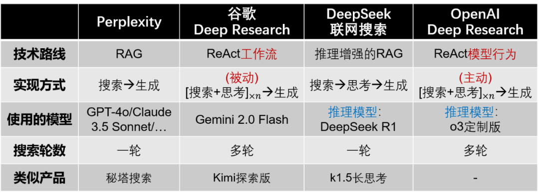 谷歌于去年12月推出了同名的AI搜索功能:Deep Research。通过ReAct的thought-action-observation循环,实现多轮搜索+思考,最后整合信息生成答案。多轮交互能够动态发现更有针对性的信息,提升答案的深度与质量。
