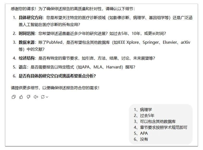 让我们发送完上述提示词后,随后ChatGPT一般会追问一些关于报告的细节方面。我们只需要根据提示,按照自己需求进行回复即可。如下图所示:发送完细节方面的要求后,ChatGPT就开始深度研究了。下图就是deep research研究后的给出来的报告。