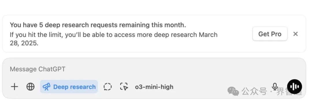 2月26日|OpenAI 宣布将向所有付费用户开放在ChatGPT上使用深度研究(Deep Research)功能,可用用户包括 ChatGPT Plus、Team、Edu 和 Enterprise 计划。 它最初以每月 200 美元的价格向 ChatGPT Pro 用户推出,但最近的更新表明其他付费层级也可以更广泛地访问,每月限制 10 次研究查询,而Pro级用户每月将获得120次查询。。 此限制可确保资源分配,同时鼓励高效使用,特别是对于高需求用户。
