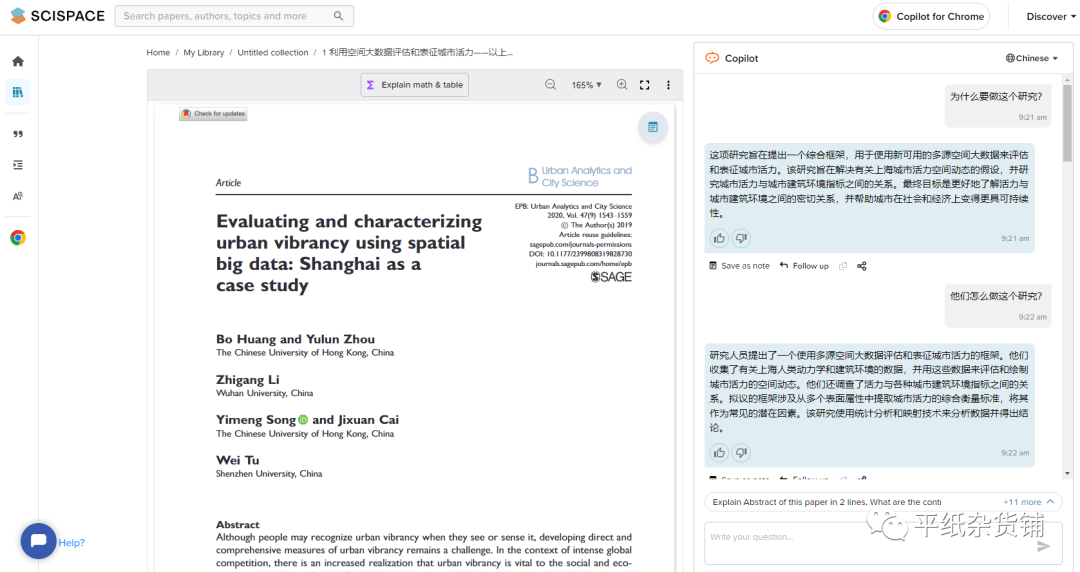 可通过上传pdf文件或者填入论文网址的方式导入文献,导入后大概显示如下界面,左侧是文献页面,右侧是类似ChatGPT的对话框,右上角能切换成中文语言,不需要手动翻译。