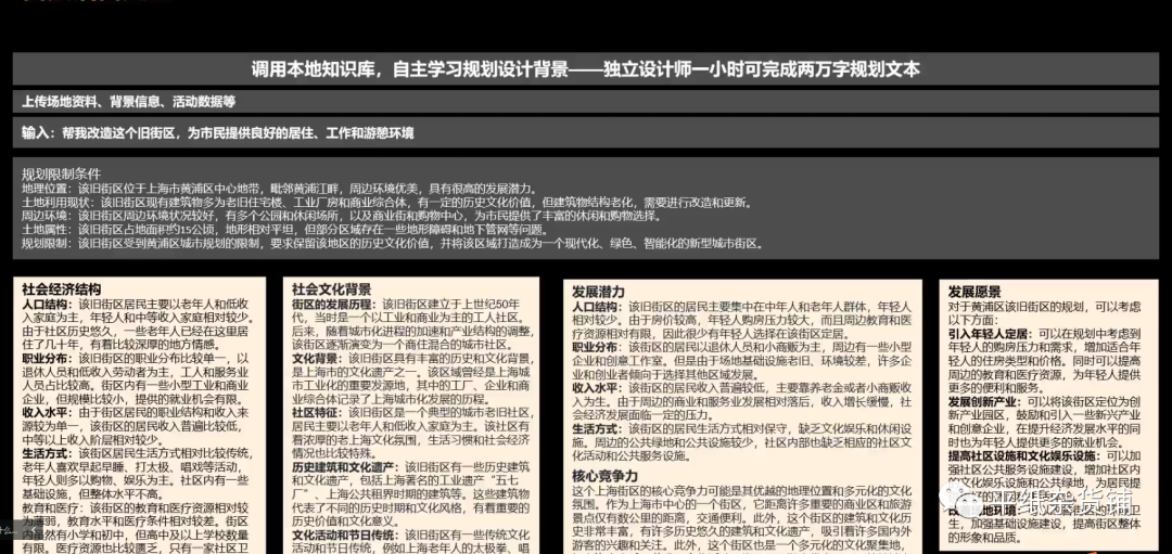 比如AIDL设计实验室做了一些调用本地知识库促使GPT自主学习规划设计知识的尝试,可以理解为用海量的规划文本去本地化训练规划领域的GPT,更有针对性,能够实现独立设计师一小时完成两万字规划文本的编写。