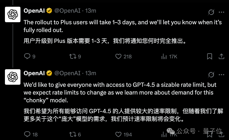 另外,OpenAI还提醒,随着能用GPT-4.5的用户越来越多,速率限制上可能会有一丢丢变化。