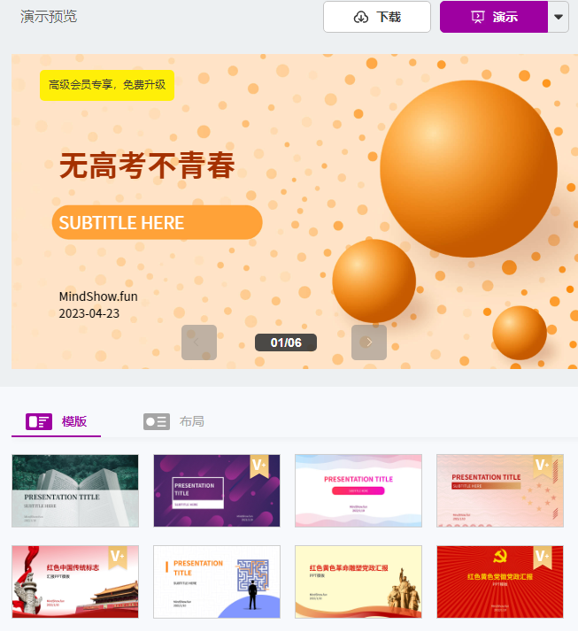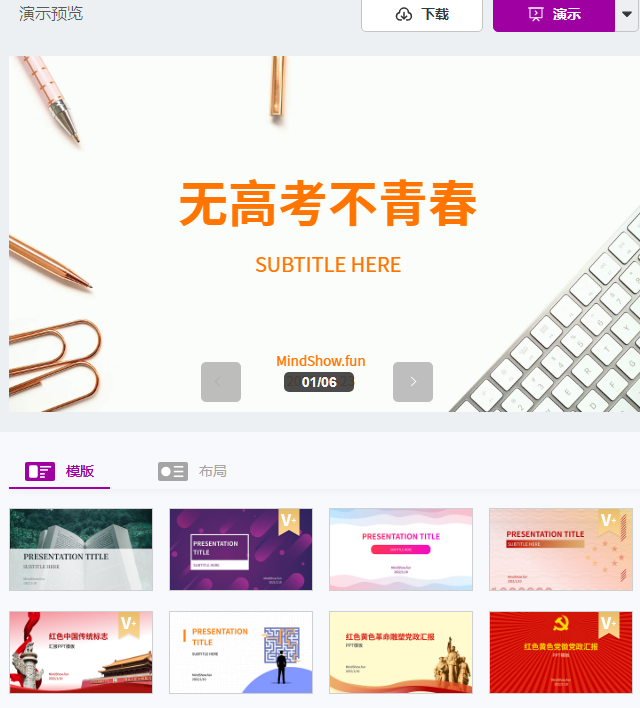 第三步:在Mindshow上导入并创建PPT,选择符合主题的模板,如需补充内容可在ChatGPT或Mindshow上操作,或下载后再编辑。