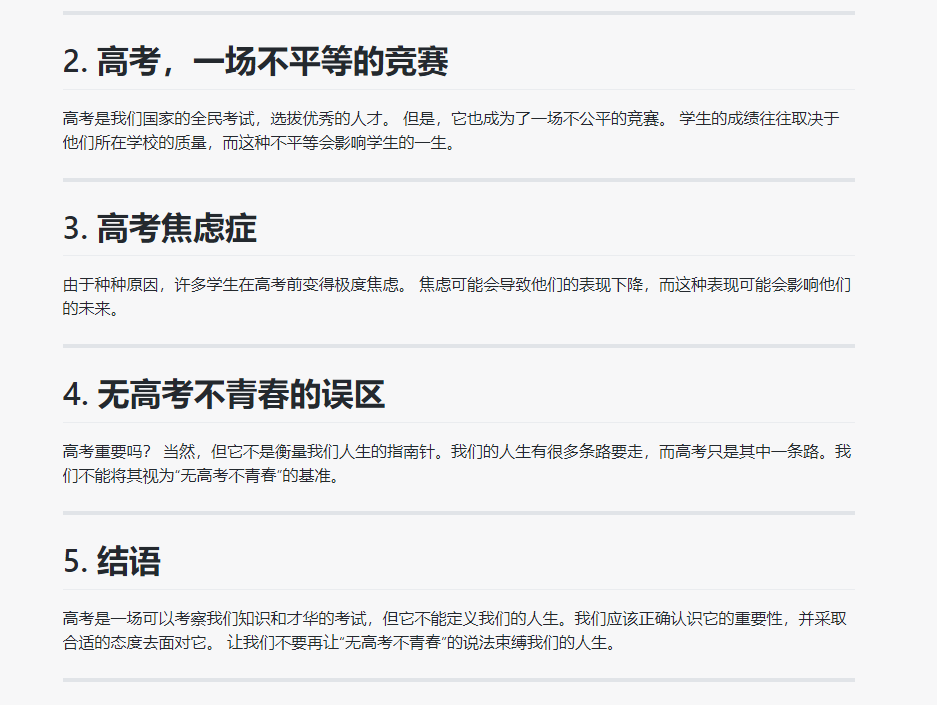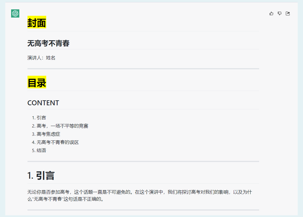 第一步:先用ChatGPT生成一个PPT大纲,以我上一篇文章做的《无高考不青春》为例:
